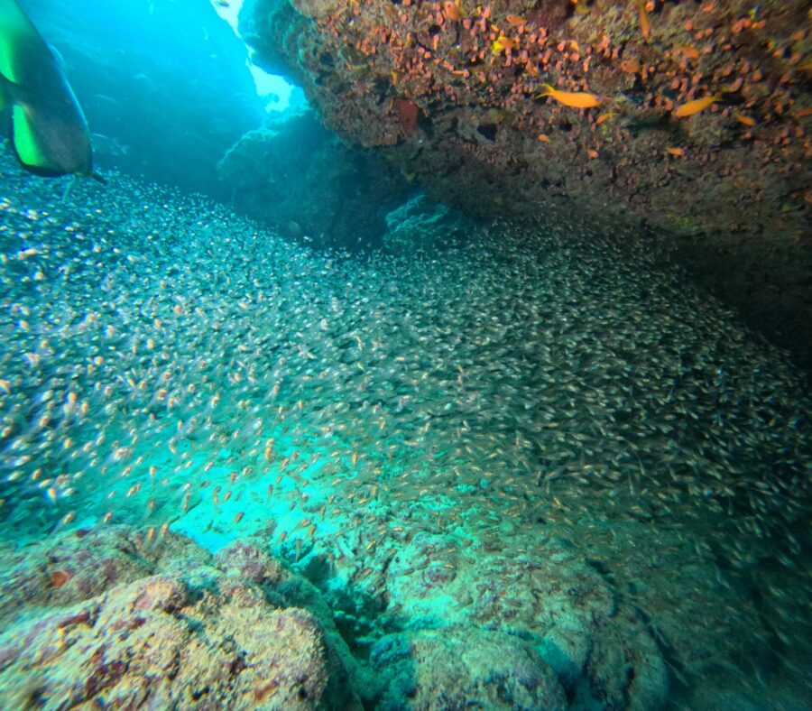 大崎アカククリの館にある大きなハマサンゴの下にはテンジクダイが沢山つき始めました!