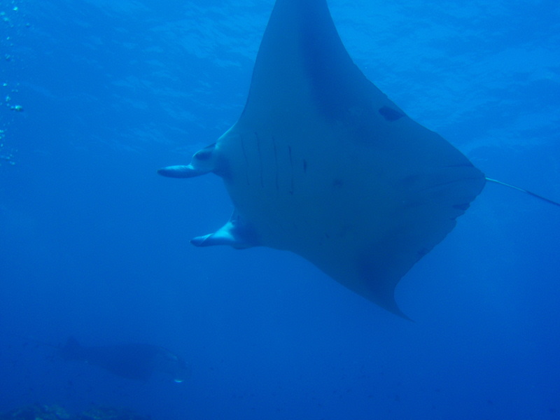浮上の時間が来てしまい、船の下まで戻って、ロープに摑まっていると、最後の別れをするように、マンタが船の近くを通ってくれました(^^♪