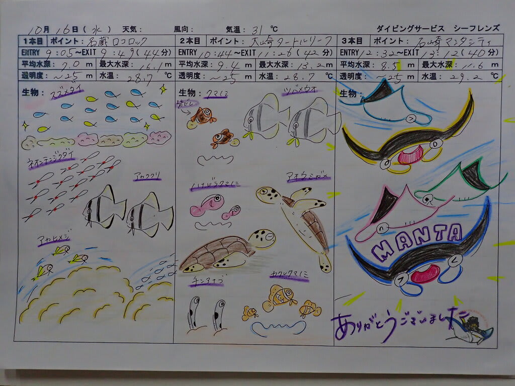 名蔵も大崎もともに透明度がいつもより良く、安心してダイビングができました。