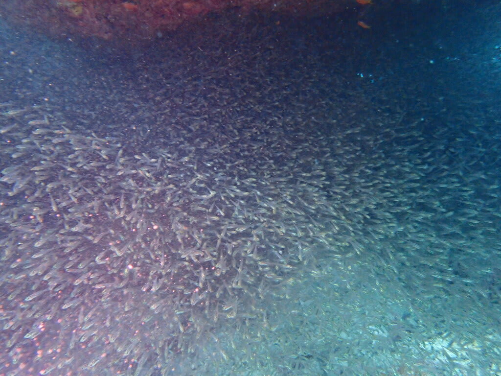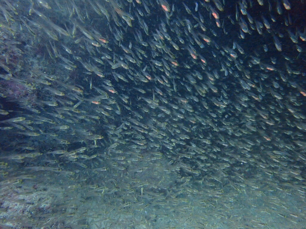 ハマサンゴの傘の下に小魚がいっぱい付いてる!