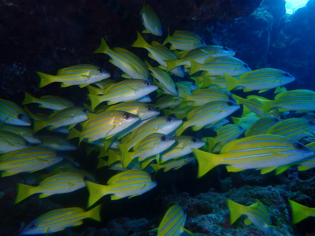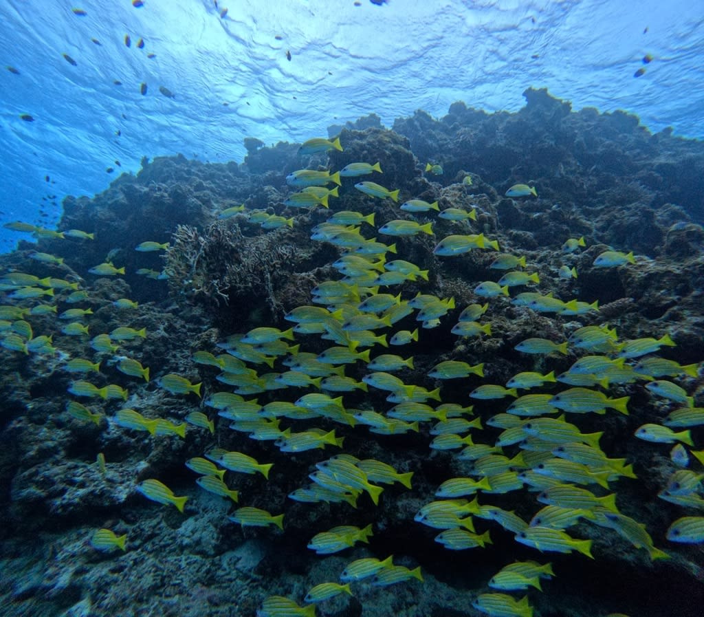 湯筋フエダイの黄色いボディが青い海に映えます!