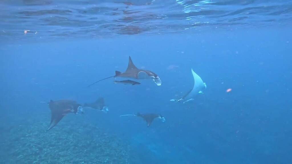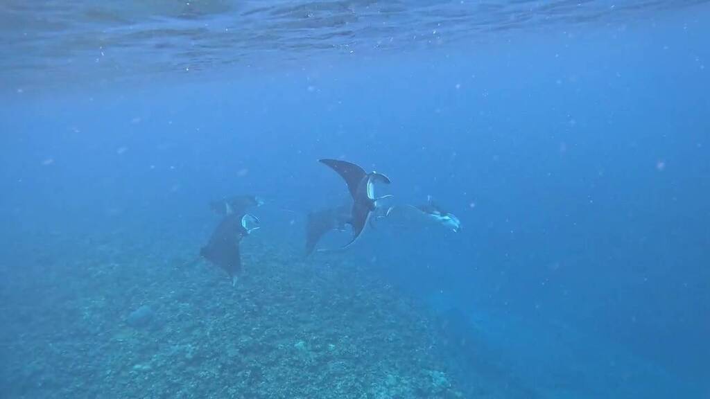 大きなヒレを広げて、複数のマンタが重なりながら舞っています。