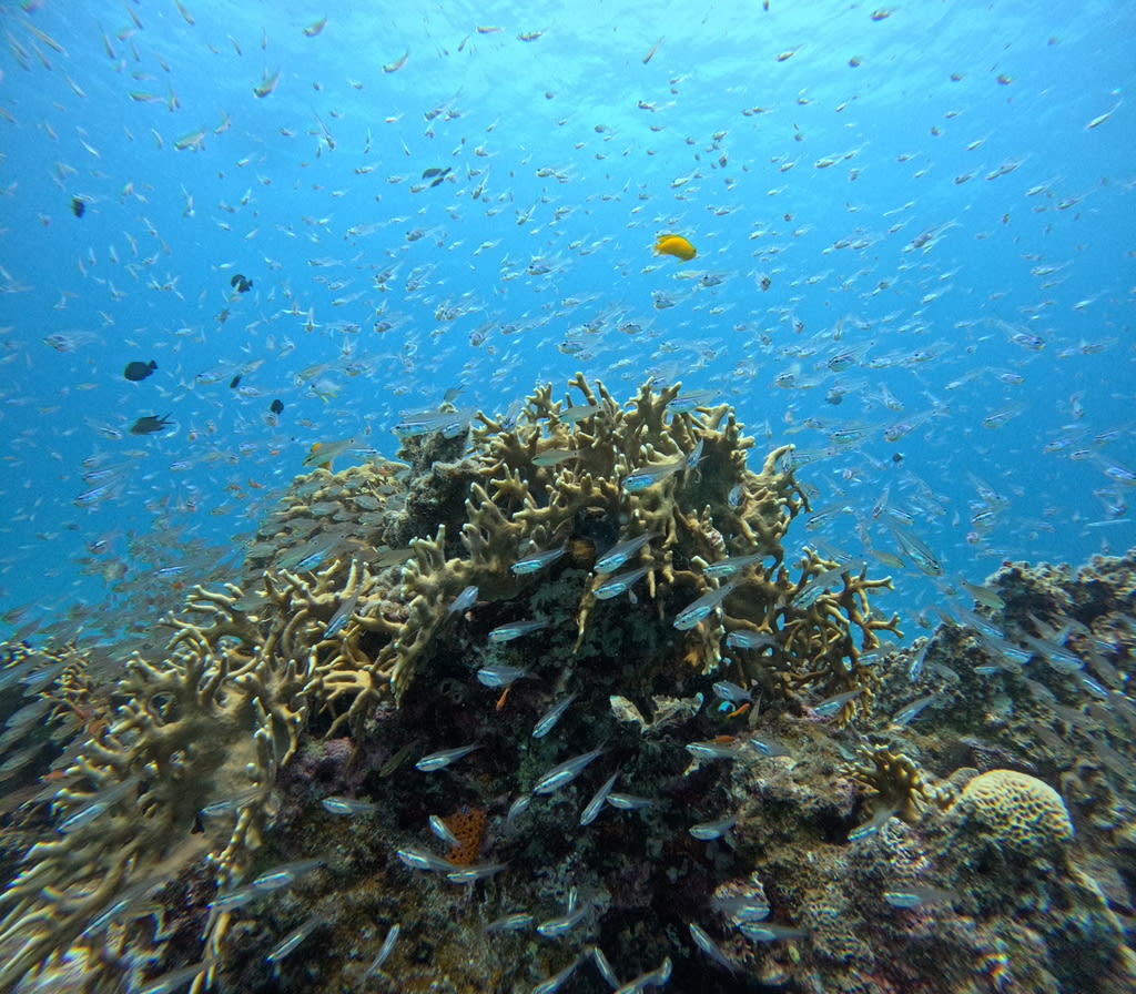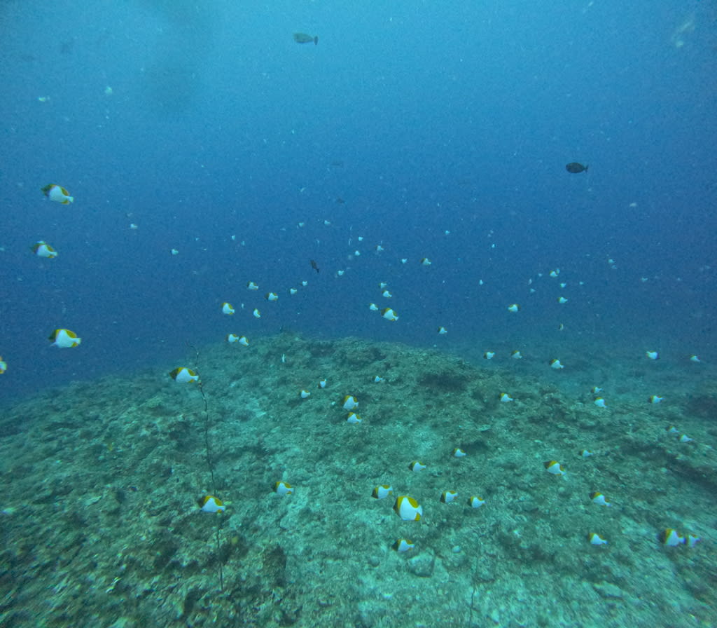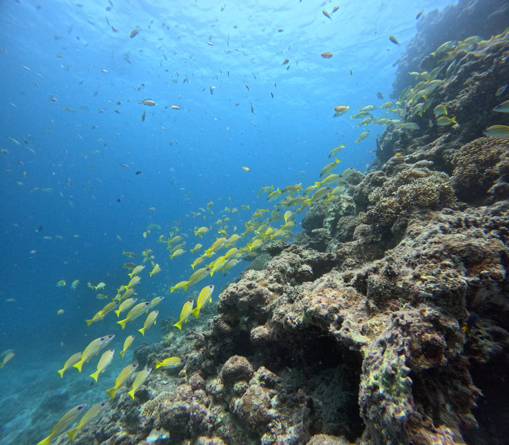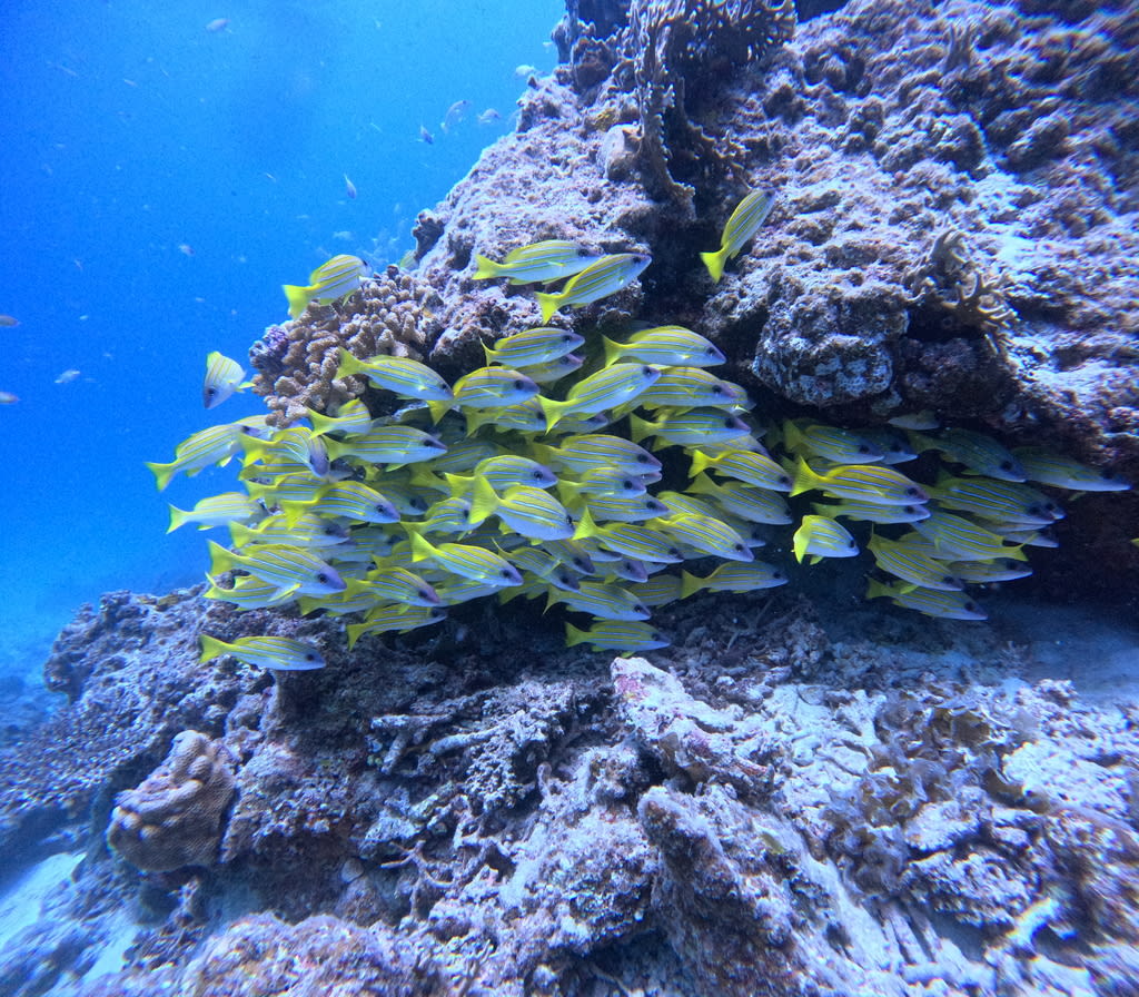 潮が当たる場所にはグルクンやカスミチョウチョウウオの群れが!