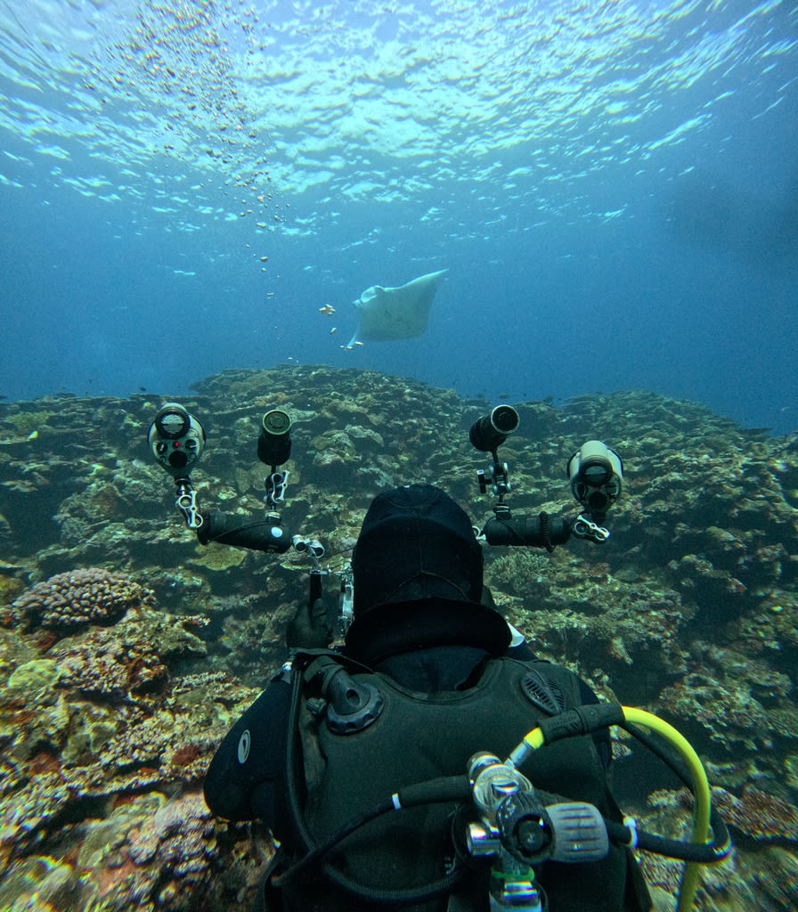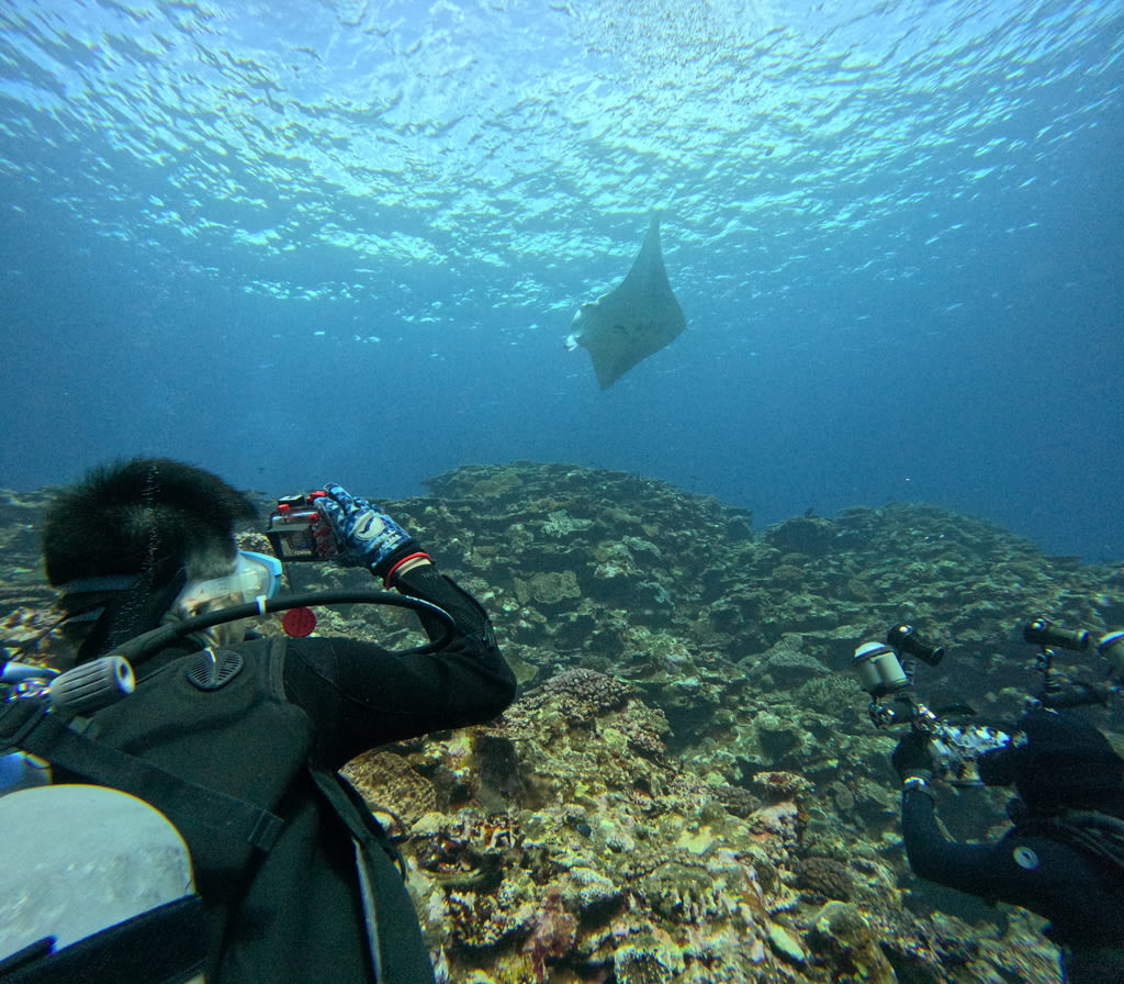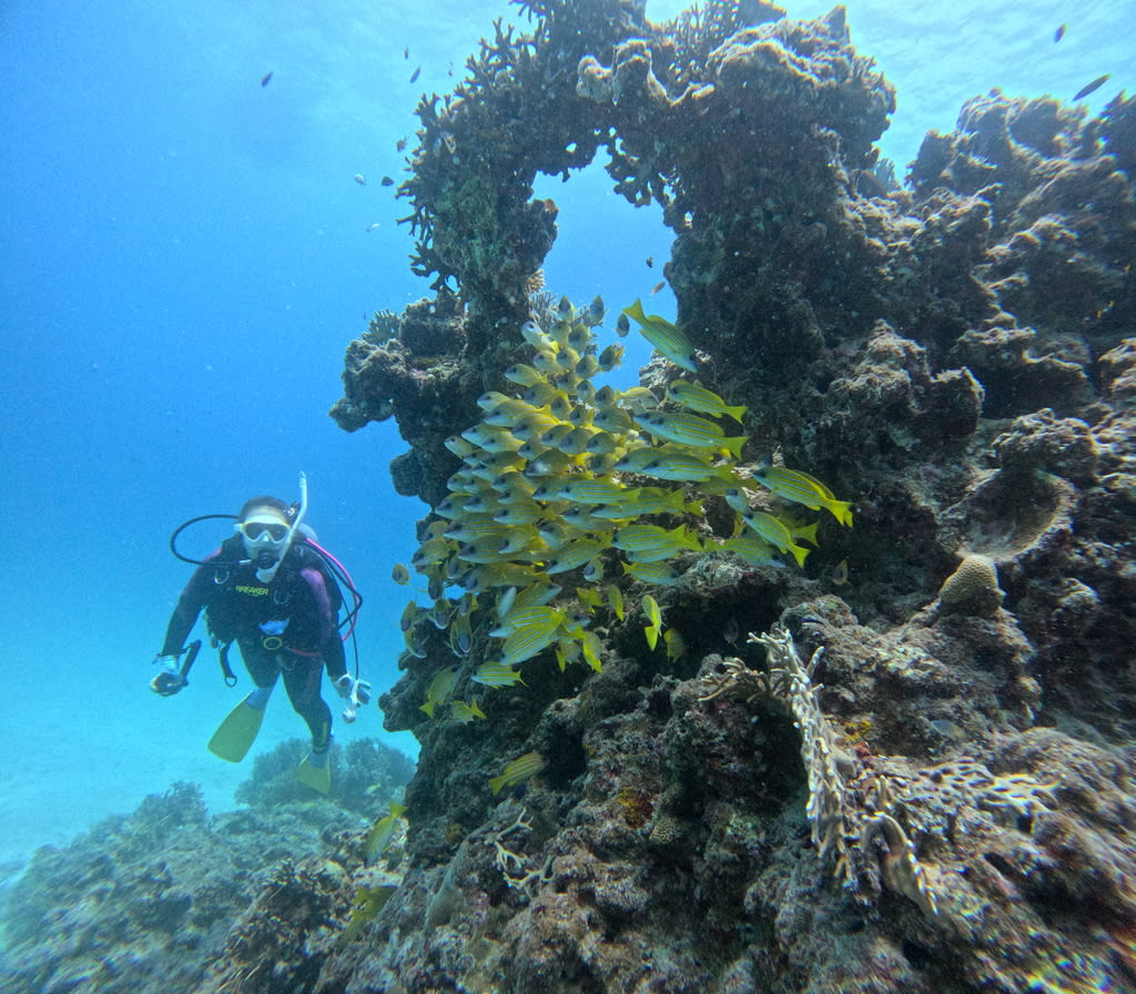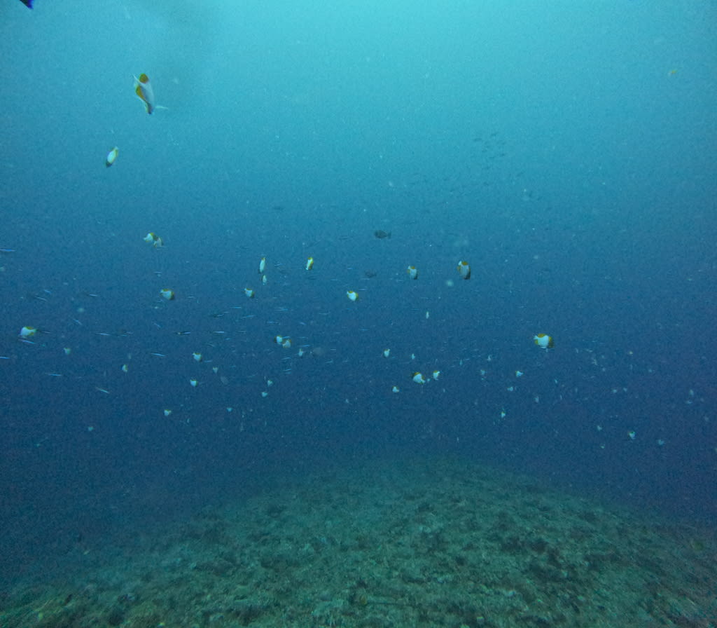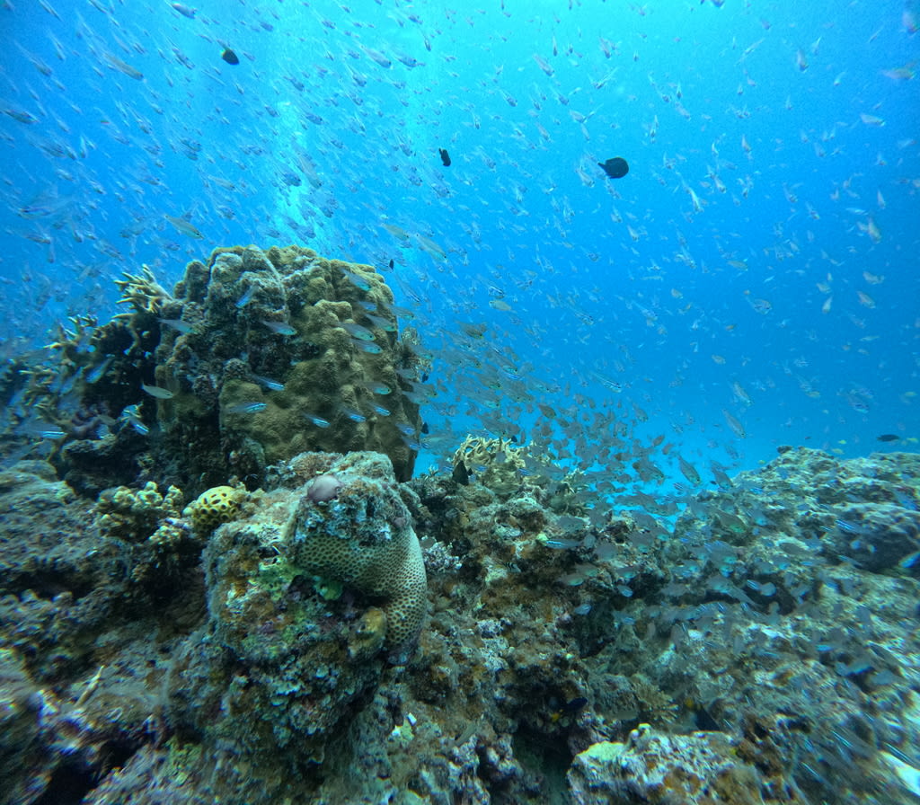 潮が当たる場所にはグルクンやカスミチョウチョウウオの群れが!