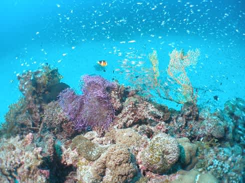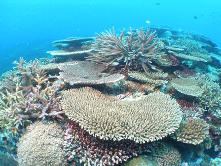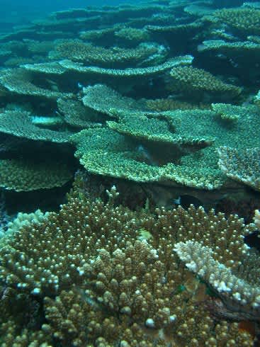 サンゴの上を泳ぐのに緊張するぐらいの群生を見せます