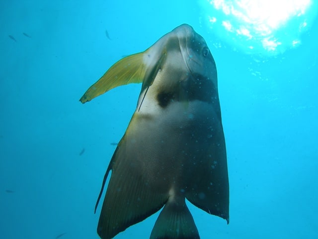 人見知りをしないツバメウオがダイバーに寄って来ては愛想を振りまくり