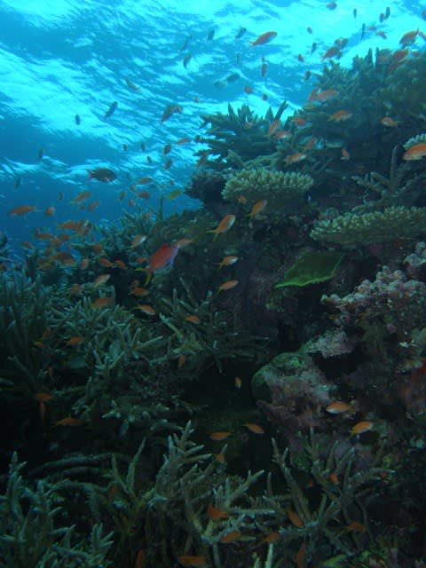 最初のポイントでは、サンゴに群がるキンギョハナダイ・アカネハナゴイ