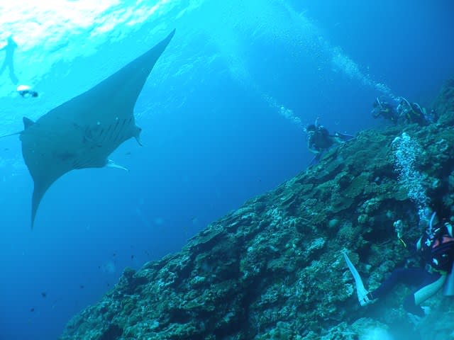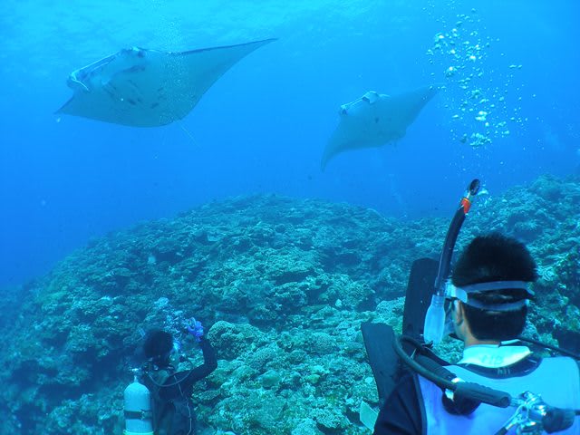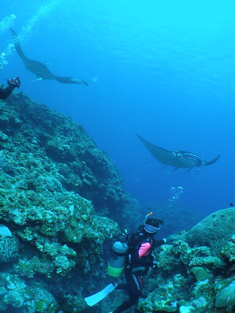 何匹ものマンタがグルグル旋回するしダイバーの頭スレスレを飛んでくるしで