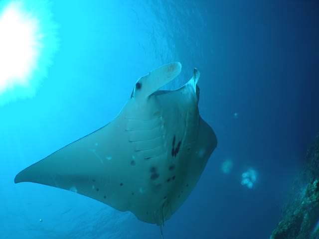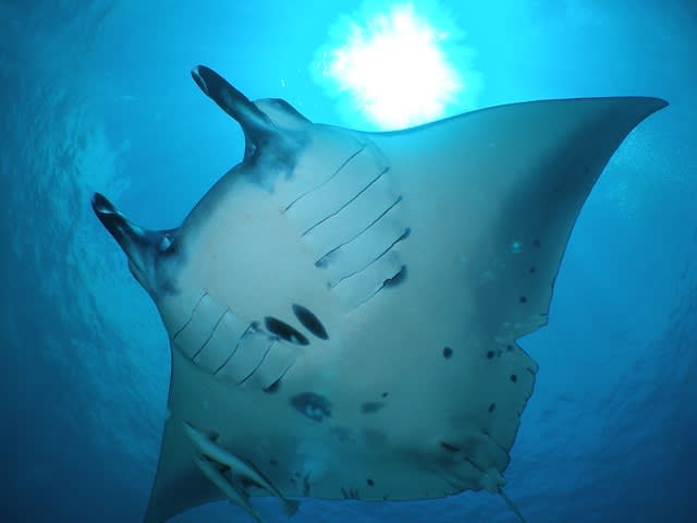 一枚の大きなメスマンタが、コバンサメ沢山引き連れて優雅に