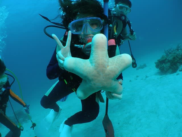 でかいヒトデや海底の掃除屋さんのナマコなどジュニアダイバーには興味たっぷり