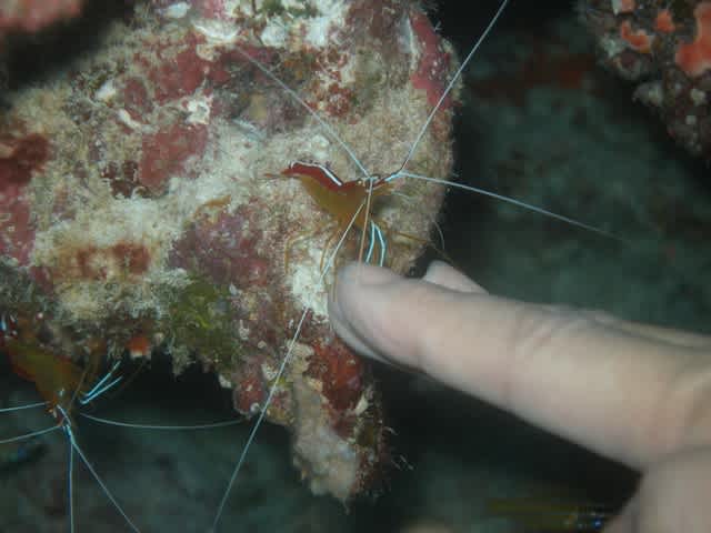 ついでに根の下にいるアカシマシラヒゲエビにも手をクリーニングしてもらい