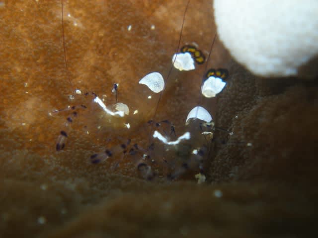 いつもは仲が悪いのか?微妙な距離で離れてるイソギンチャクエビも寒くなると