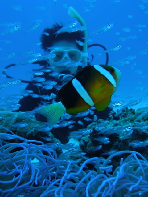 ニモに夢中になるミノシマさん、その隣でホンソメワケベラにクリーニングされて