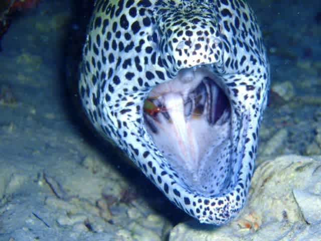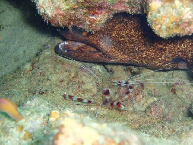 根の下では、ニセゴイシウツボが口を大きく開けてクリーニング