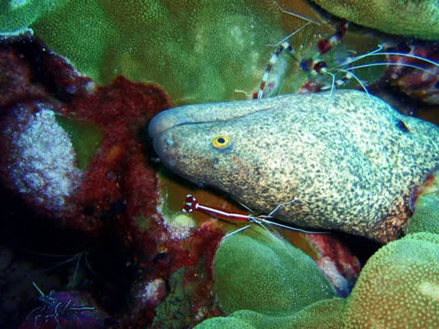 アカシマシラヒゲエビのクリーニングに、ウツボが気持ち良さそうに体をよじっているじゃないですか!(^^)!きっと、“う~~ん幸せ~~”と言っているんじゃないですかね♪♪気になるのは、近くに居るオトヒメエビですが・・・一緒にクリーニングのまねごと!?真相は、謎のまま。。。
