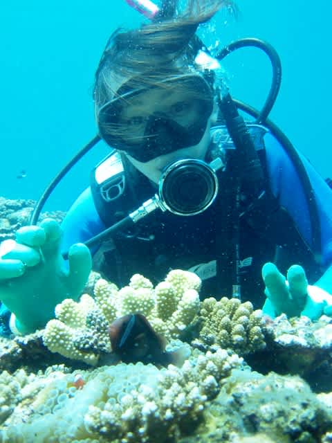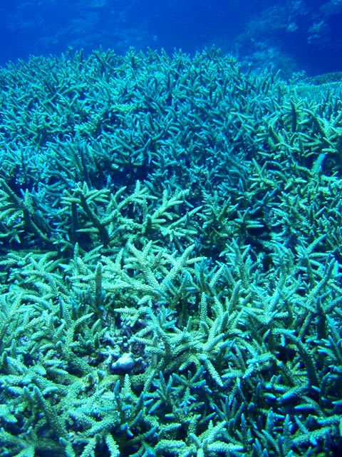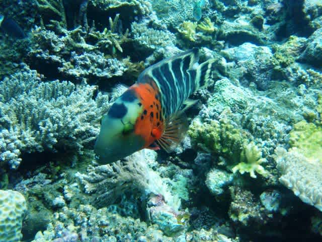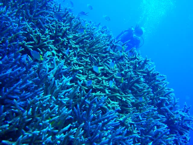 なかなか顔を上げません!下のサンゴ&お魚に夢中♪