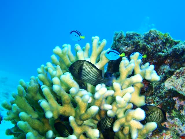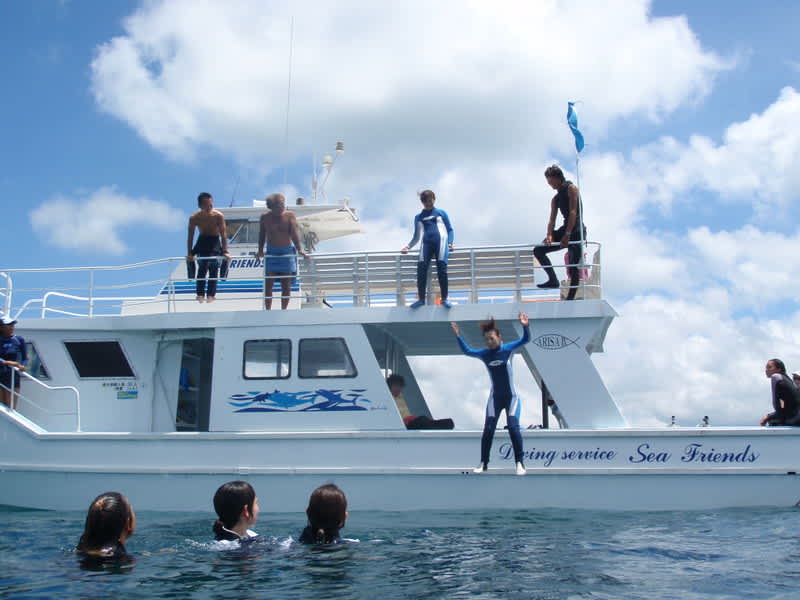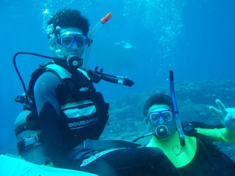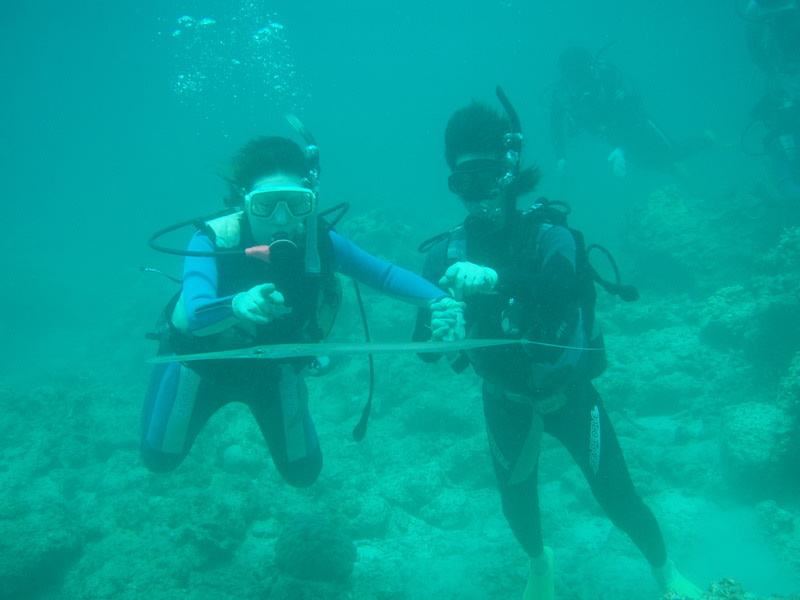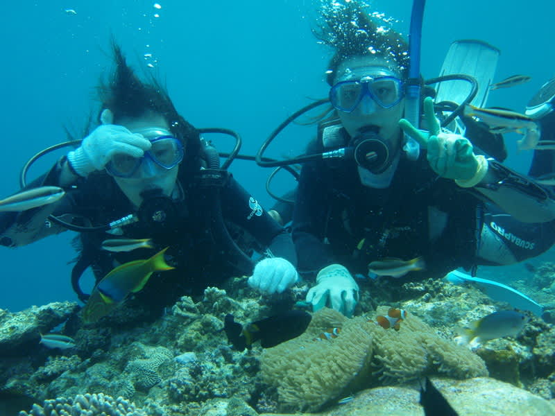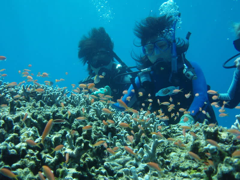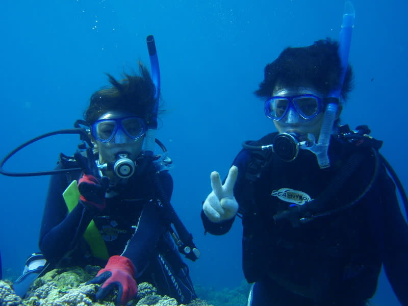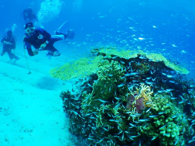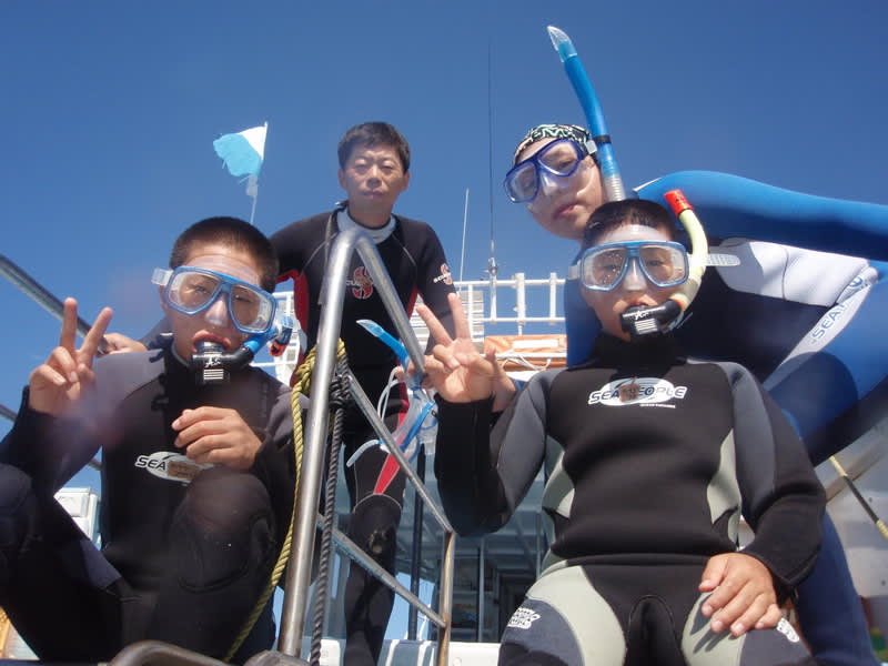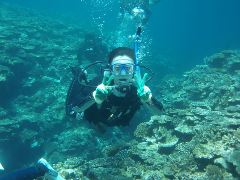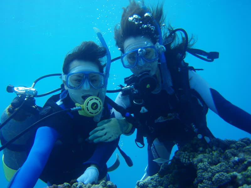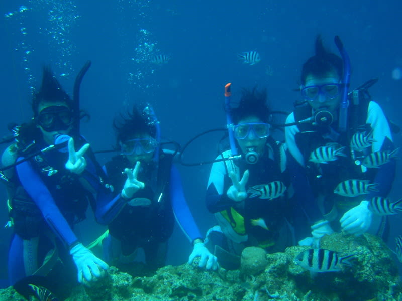 先ほどスノーケルで見た、サンゴや魚を今度は実際に手に触れて見たり、同じ目線で一緒に泳いだり、みんなとっても上手にダイビングを楽しんでいました(^^♪
