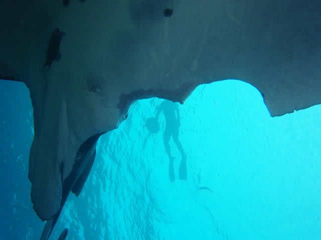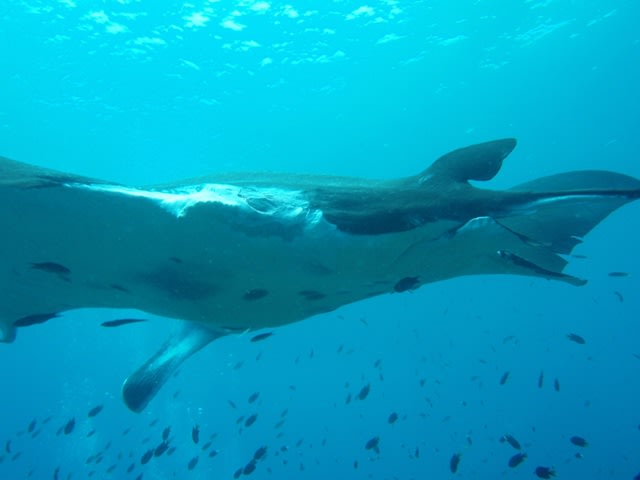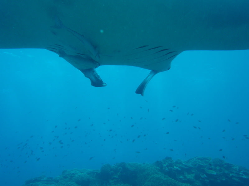 じっくりマンタを見て、船の下まで戻ると、またまた一枚のマンタが今度は「また来てね!」と言わんばかりに、近づいてきて去って行きました(^^♪