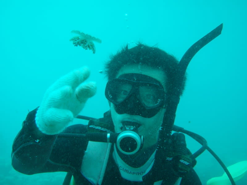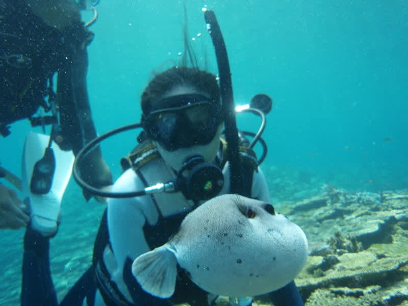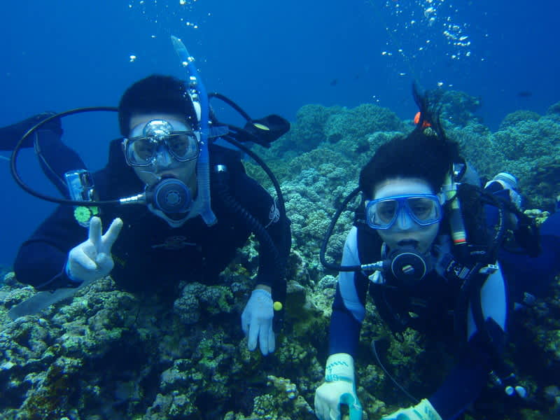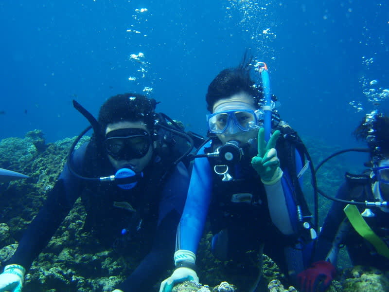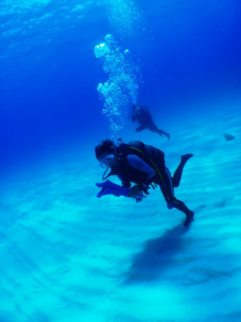 水中で呼吸できることに戸惑いながらも、魚と同じ目線で泳ぐことができるダイビングに感動していました(^^♪
