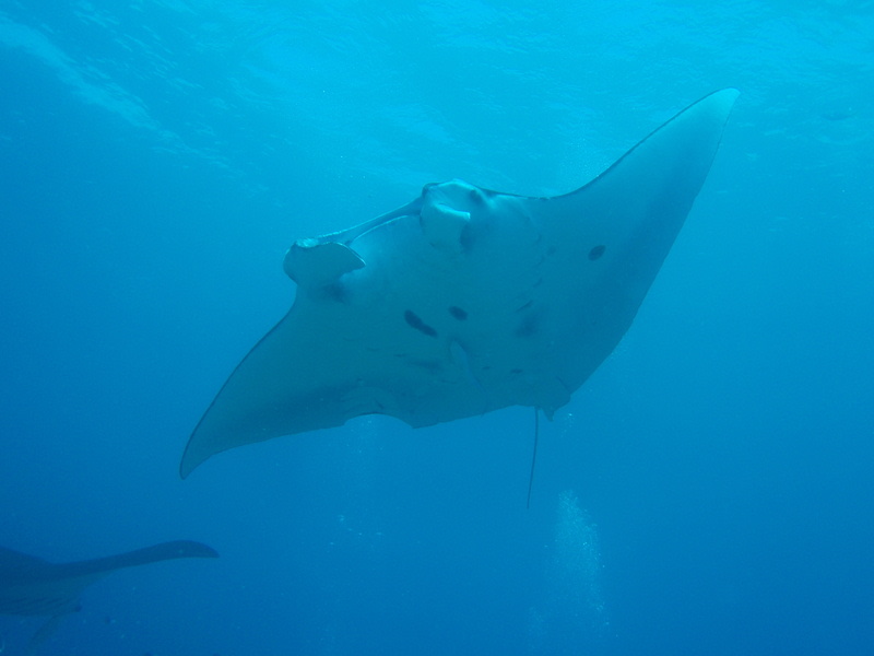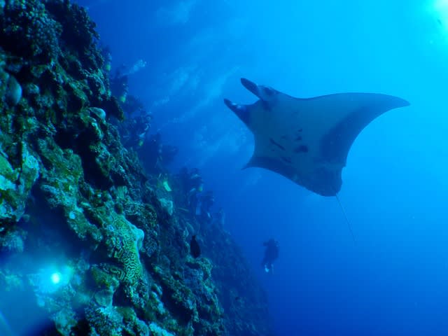 海に入ってすぐに一枚のマンタが、船の下を通って行き、今日も安心しつつ全員そろって泳いでいくと、なんと3枚ものマンタがその姿をダイバーに見せつけていました(*^_^*)