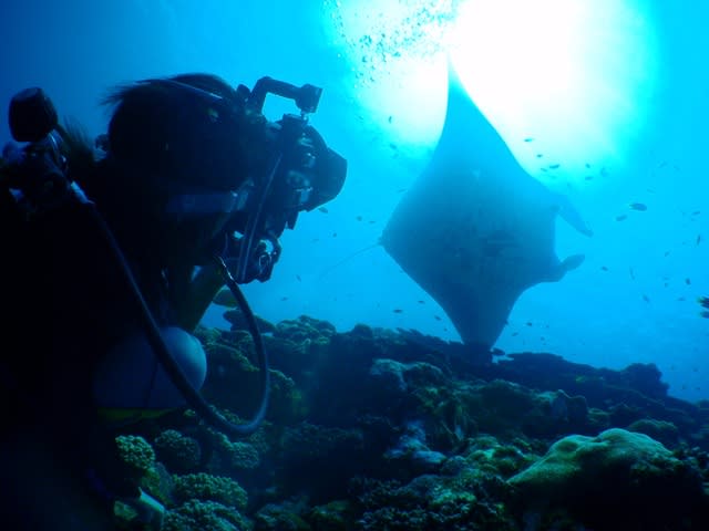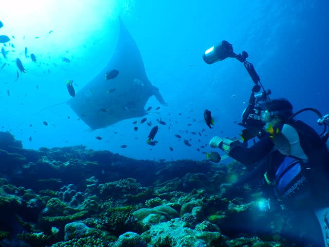 ゲストの皆さんは大きなカメラ持ってる方が多かったので、 最初の一瞬で終わってたら怒られてたかも(^。^;) 最後の10分は大接近マンタ朗でしたので、良い写真撮れた
