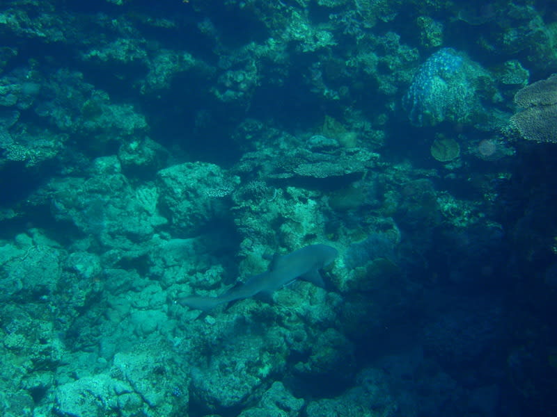 そして少し泳いでの移動中、オーナーが指差した先には、な・なんと、サメの後姿が(ノ゜⊿゜)ノびっくり!!