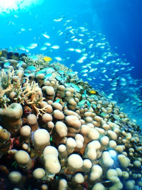 砂地にある大仏の頭には沢山のデバスズメダイが群れてたり