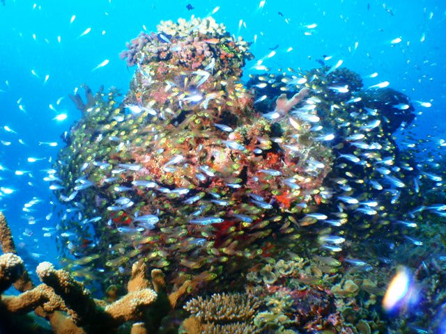 スカシテンジクダイも多いし、大仏の頭に群れるデバスズメダイ