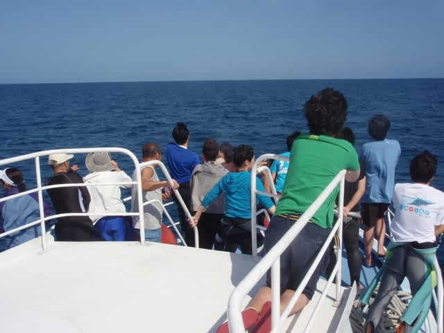 乗客、スタッフ、みんな集まって船の上からイルカウォッチング♪