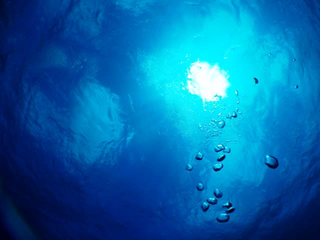 水底から水面の方を見上げると、小魚たちが、太陽の光を反射して、