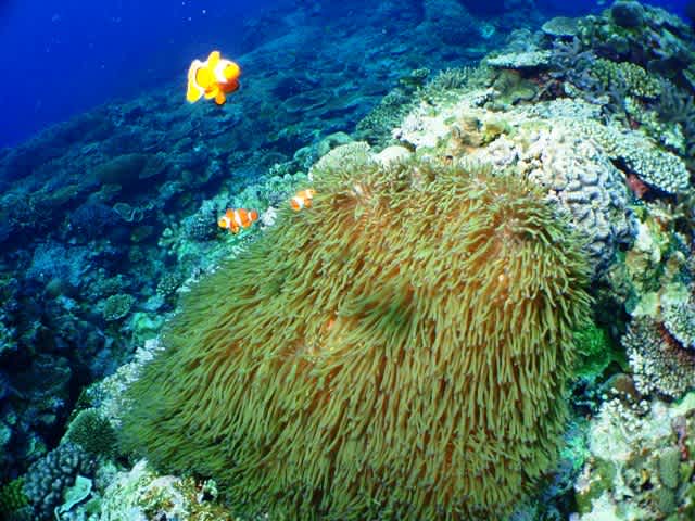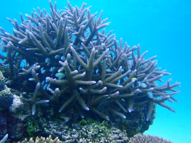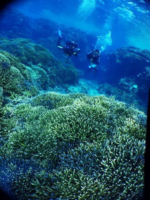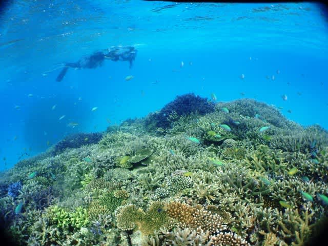水中を覗けば一面に広がるサンゴの周りにはデバスズメダイが群れ