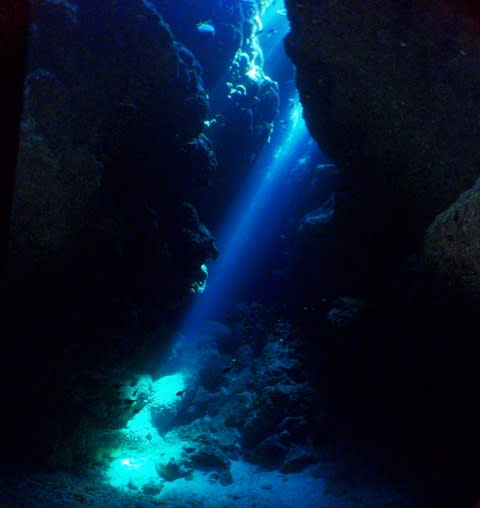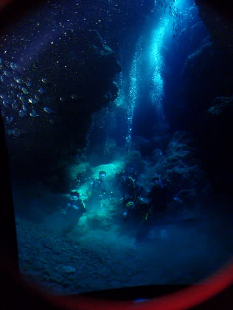 お天気良いので、うえから差し込む光と、地形から抜けて見える青さとで