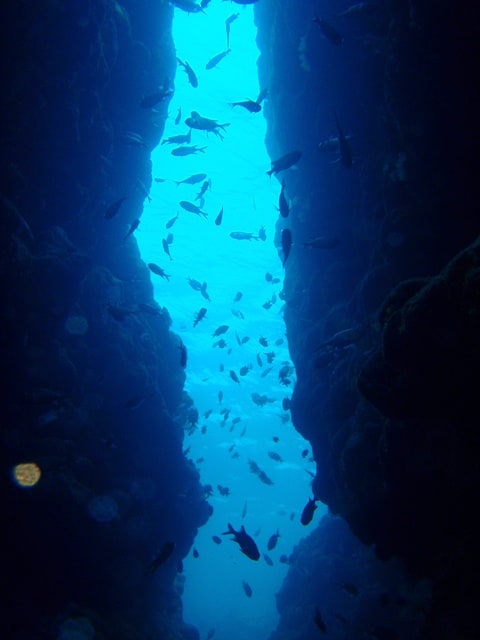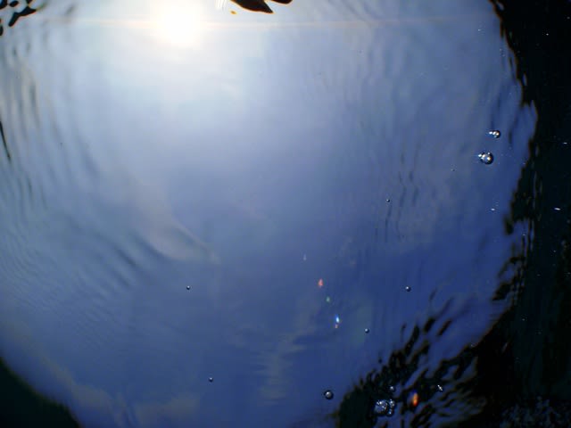 そして水底から水面を見上げると沢山のキレイなデバスズメダイが太陽の光に