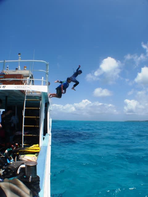 みんなで島弁当を食べ、そして今日の船の上はみんなで飛びこみ大会が始まって