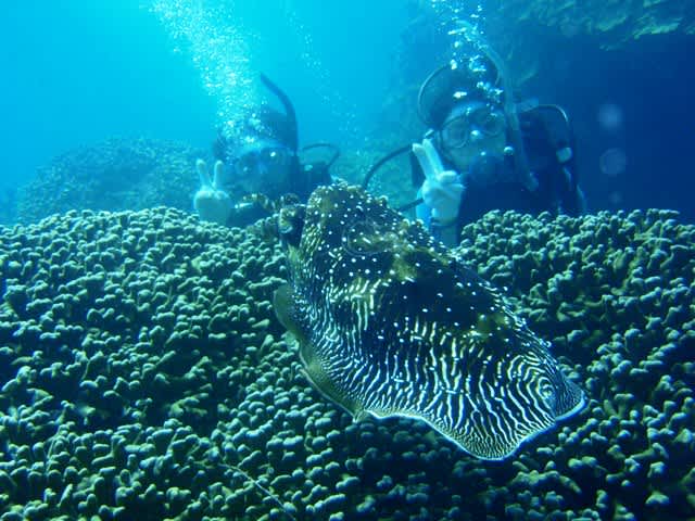 水中ではハマクマノミと写真を撮ったり、コブシメとシャーっと威嚇のやりやいを