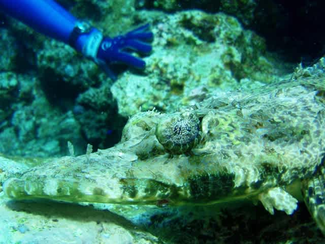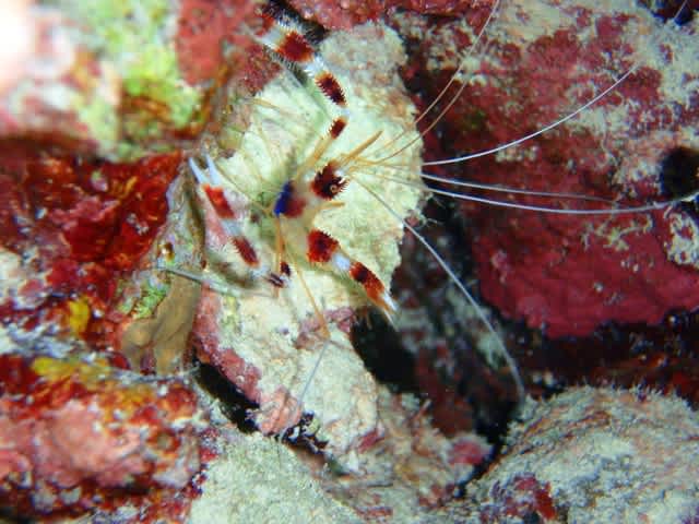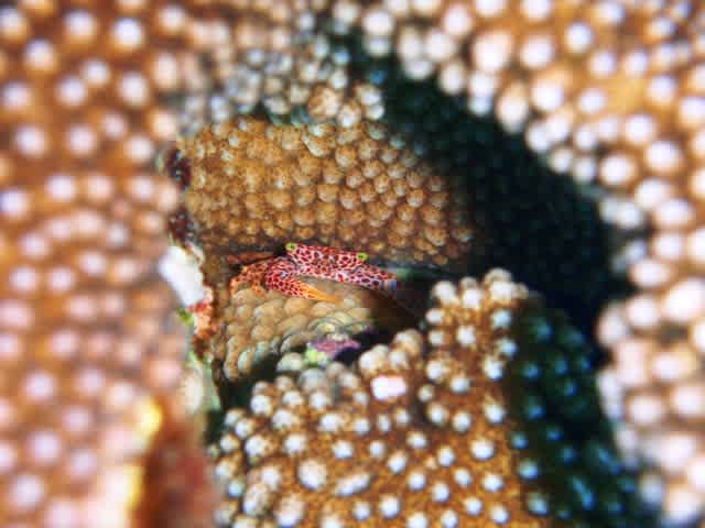 サンゴの隙間にいるカニやウミシダに隠れている