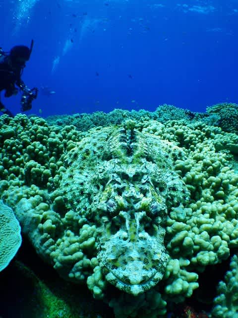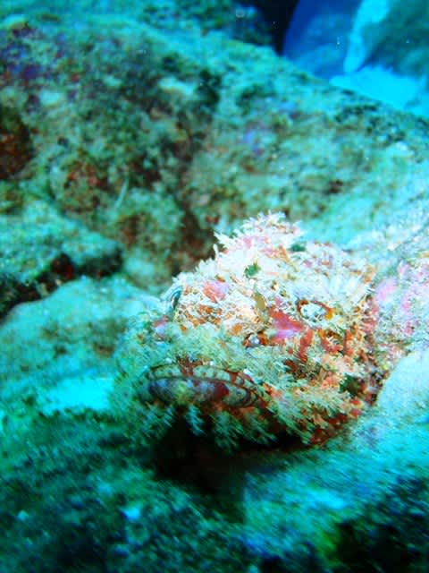 ハナミノカサゴが捕食しようと狙ってましたよっ!ガレ場には白とオレンジの