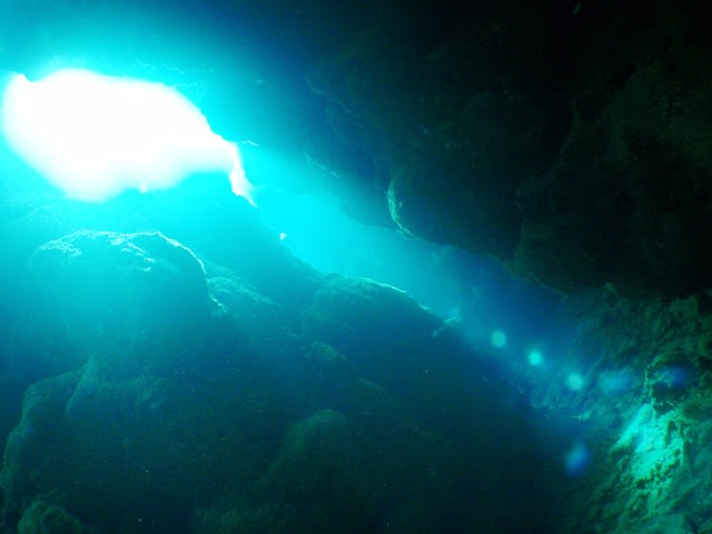 穴の中はキンメモドキとリュウキュウハタンポが群れて、光が差し込んでキレーイ!!