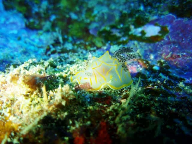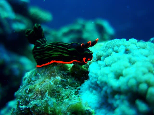 ガレ場では、オレンジの縁取りがまぶしいアカフチリュウグウウミウシや