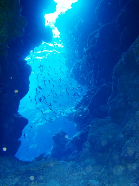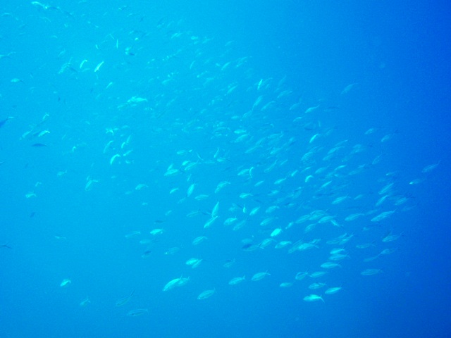 水中には数え切れないくらいのデバスズメの群れやクロスズメダイの群れが