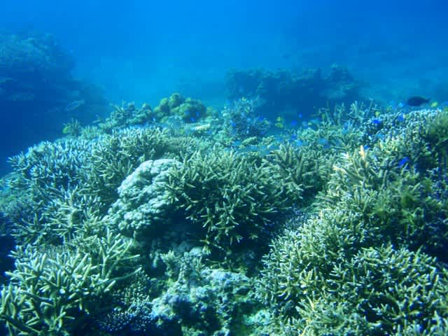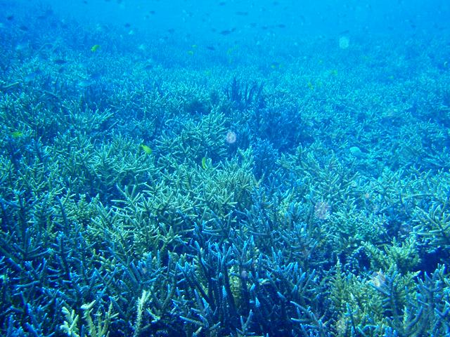 ( ̄▽ ̄) 水深3mくらいには枝珊瑚やテーブル珊瑚がびっしりで水深を少し