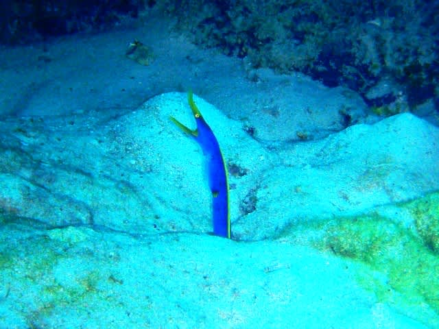 砂地の海を泳いで行くと、ハナヒゲウツボやスカシテンジクダイ、イソギンチャクモエビに