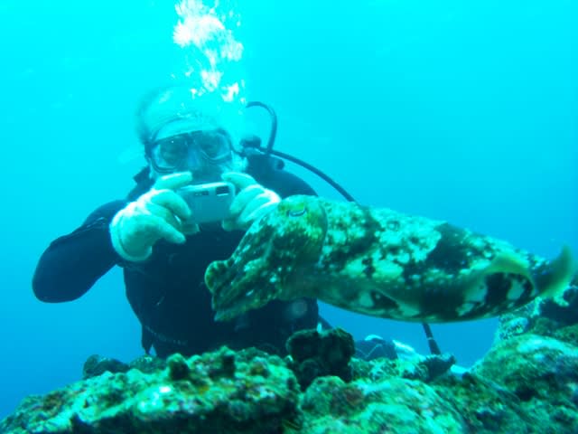 そして、本日最後のポイントでは、体験チームは水中でコブシメを見たり