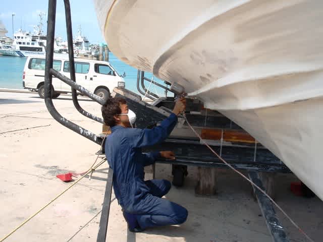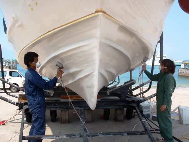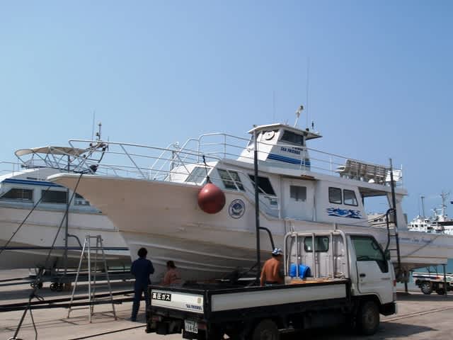 今日はノーゲストでしたので、先日から港に上げているデカ船の改造計画も終わりが近づいてきました(^^♪船のエンジンのオーバーホールも無事に終了し、そして船底も塗りなおしてきました(^_-)-☆初めてのスプレーガンを使って船底を塗ったのでスタッフ一同みんな真っ白になっちゃいましたよぉ(^_^;)髪の毛も鼻毛も(*^_^*)ワラ