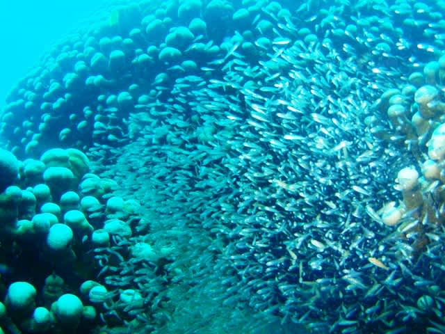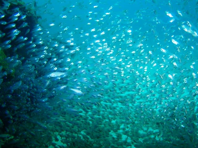 そこに群れるデバスズメダイ達もキラキラ反射して