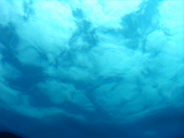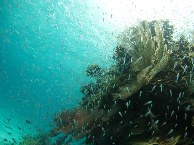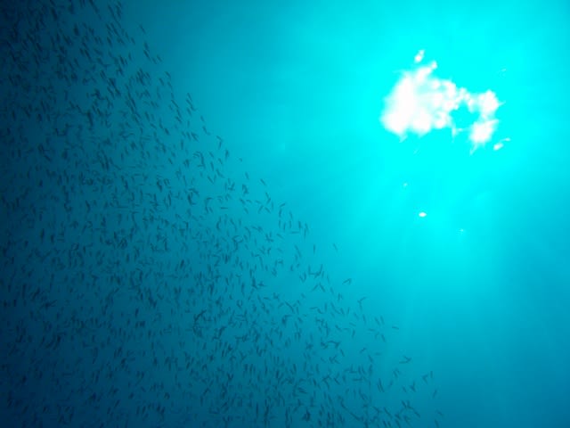 たくさんのデバスズメダイが群れてる水面をまったりと泳ぐと