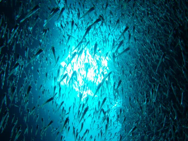 抜群の透明度の中泳ぎ回るキビナゴ、光が反射して