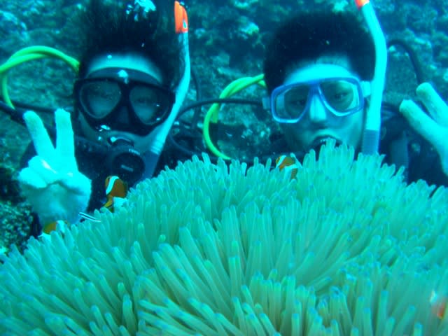 クマノミと記念写真を撮ったり、サメのウ○ンコみたいなタカセ貝を触ったり