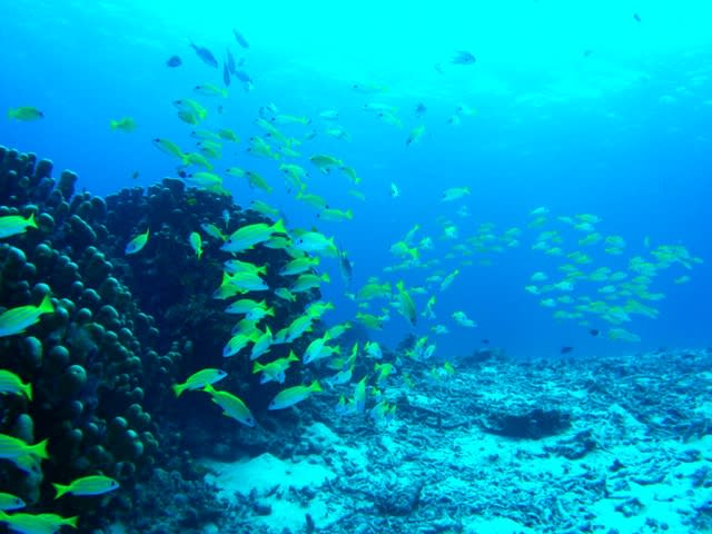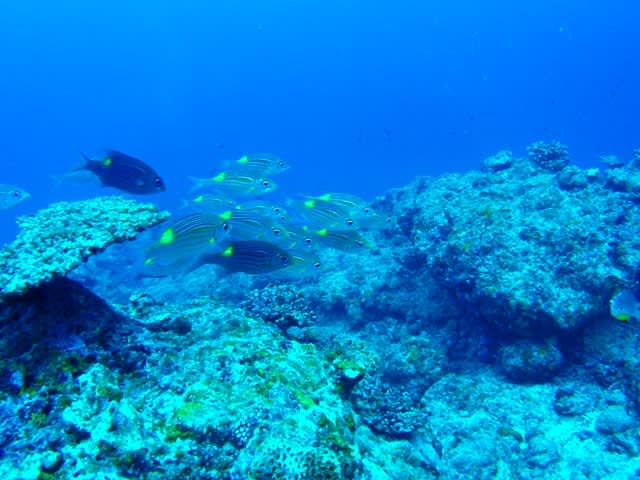 ジャガイモみたいなサンゴの上には、黄色のヨスジフエダイと水色のデバスズメダイが