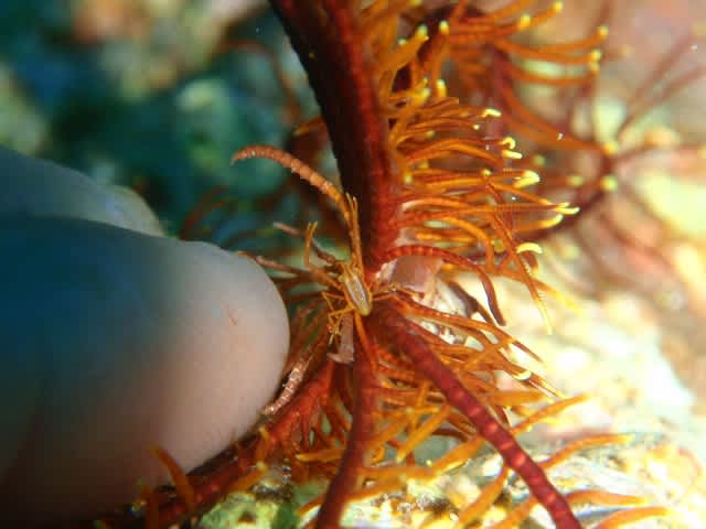 変な生物に隠れているエビ、